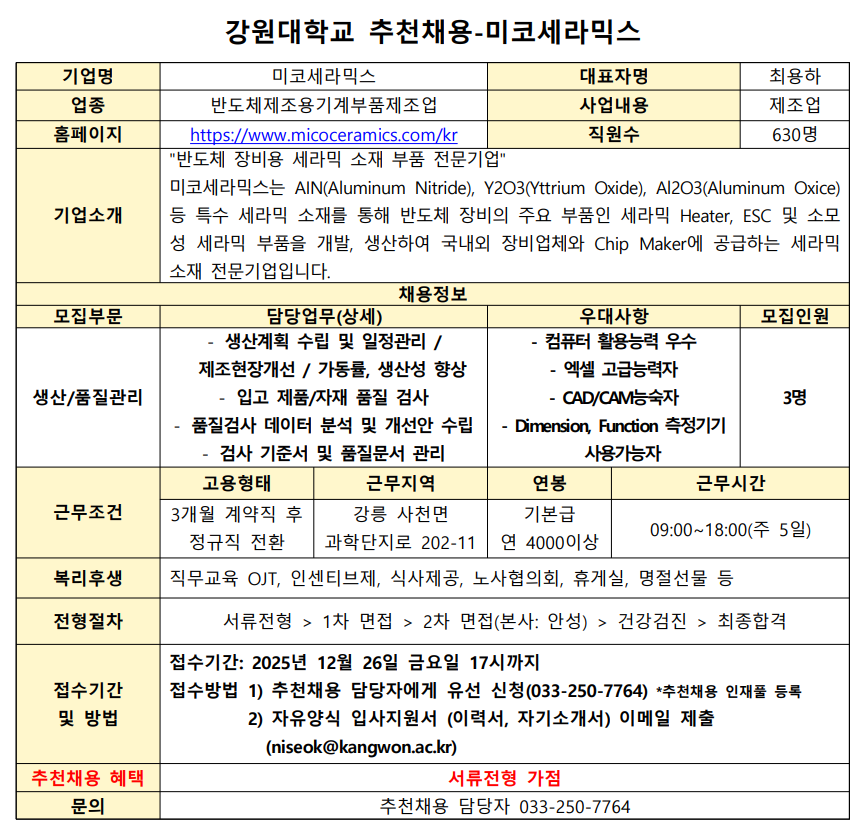 생산/품질관리 채용을 강원대학교 추천채용으로 진행합니다.